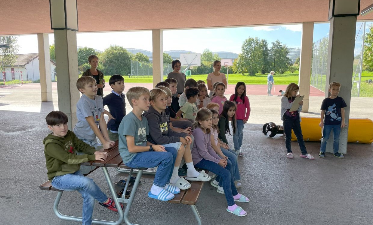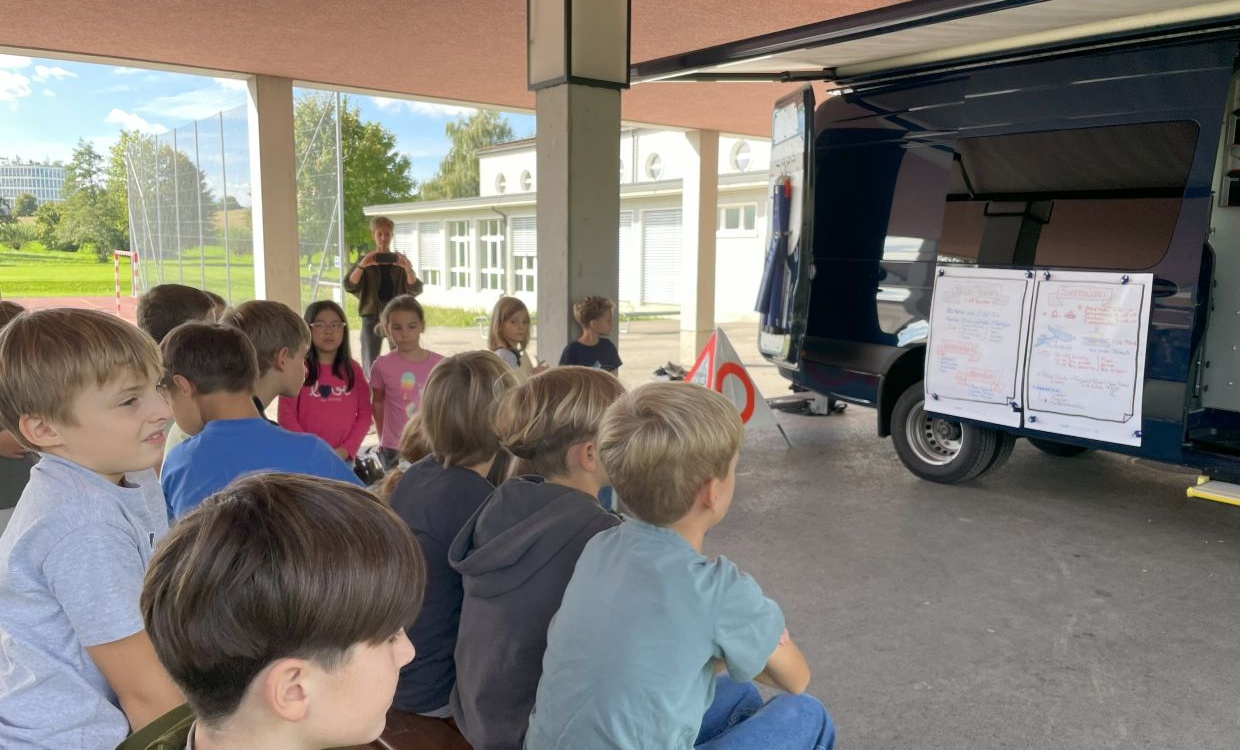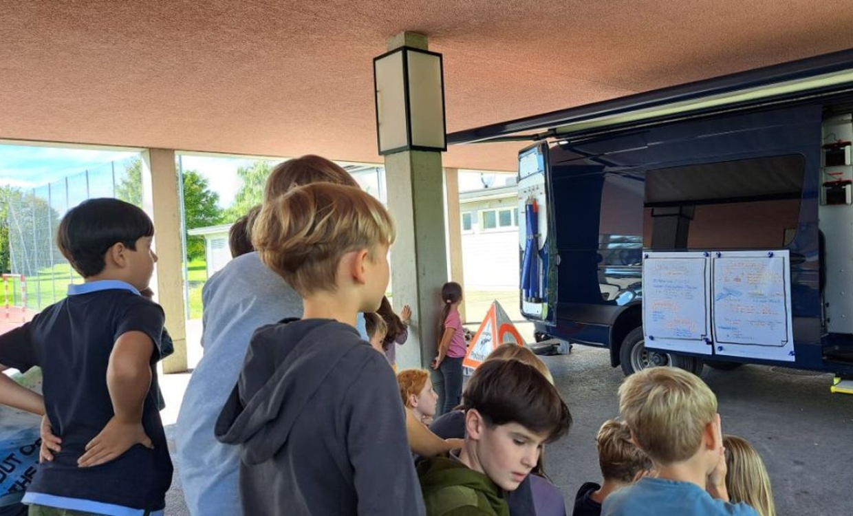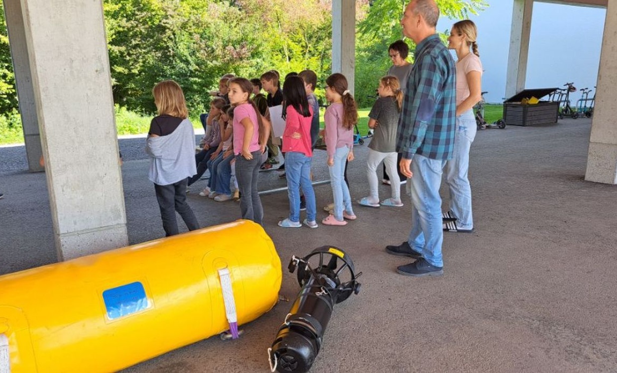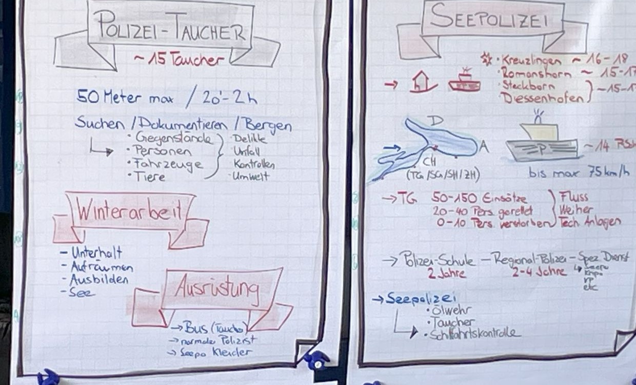 Heute kam ein Seepolizist zu uns in die Schule. Er kam mit einem grossen Tauchbus voll mit interessanten Gegenständen: Eine Tauchausrüstung, Markierungsbojen, Auftriebskörper und vielem mehr. Wir hörten spannende, schöne und manchmal auch schaurige Details von der Arbeit eines Polizisten auf dem Bodensee.