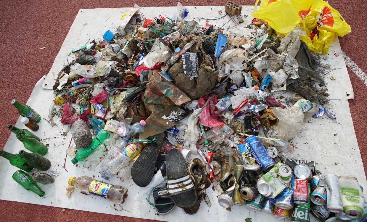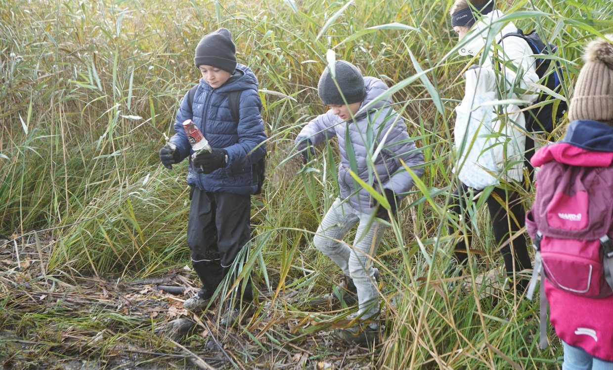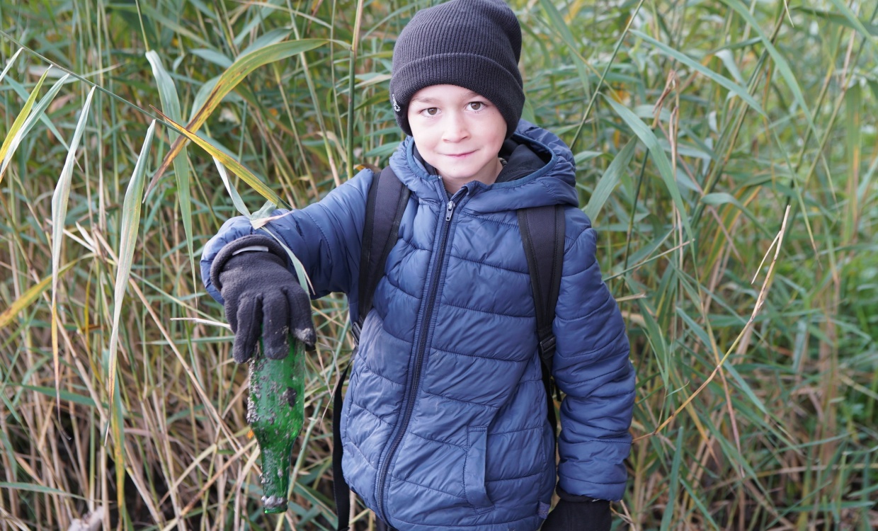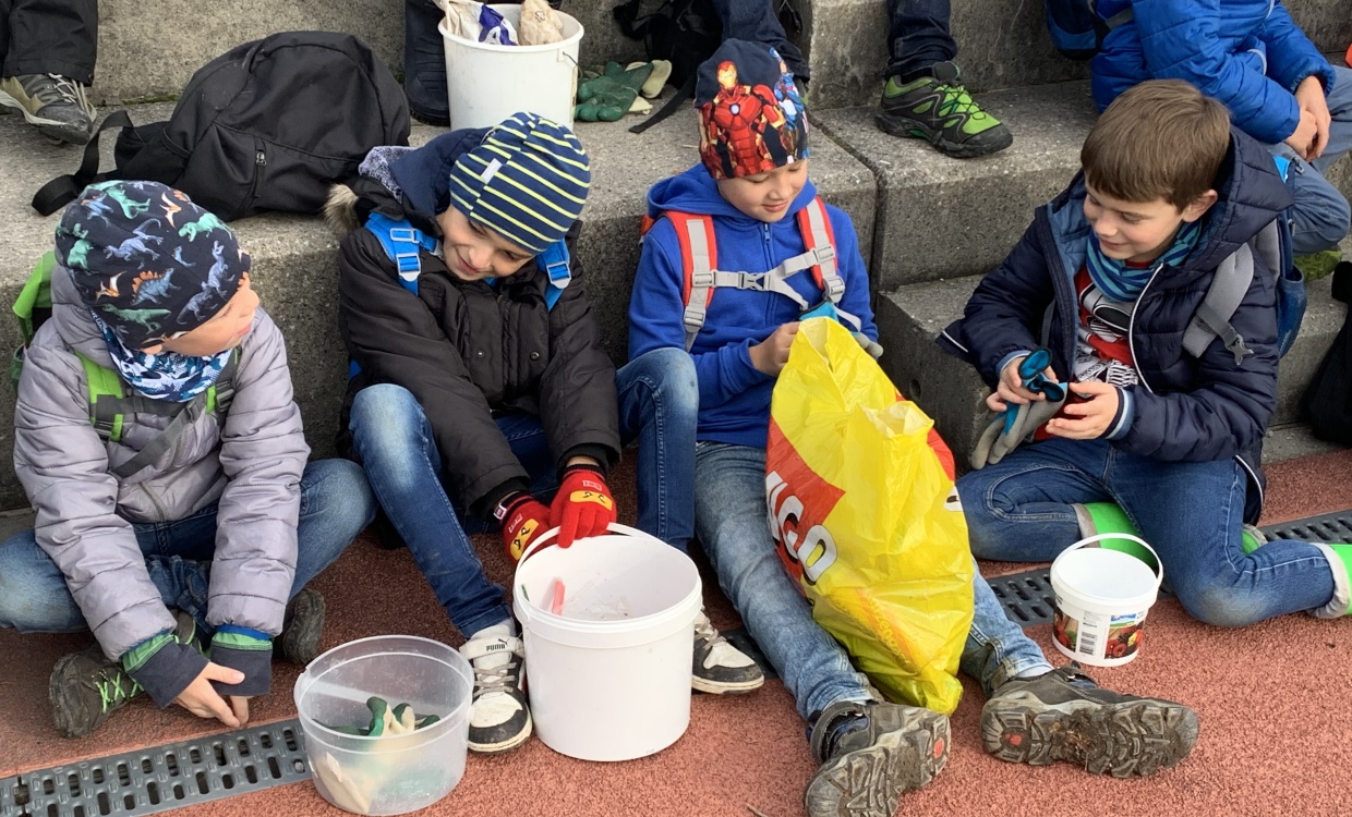 "Wir haben am Seeufer viele Glasflaschen, Dosen, Kaffeebecher, verschiedene Schuhe und sogar einen Rückspiegel gefunden. Auch sonst haben wir sehr viel Müll gesammelt. Diesen Tag fanden wir toll, weil wir etwas Gutes für die Umwelt getan haben." (Lea, Amelie, Louis, Ramon, 5.Kl.)