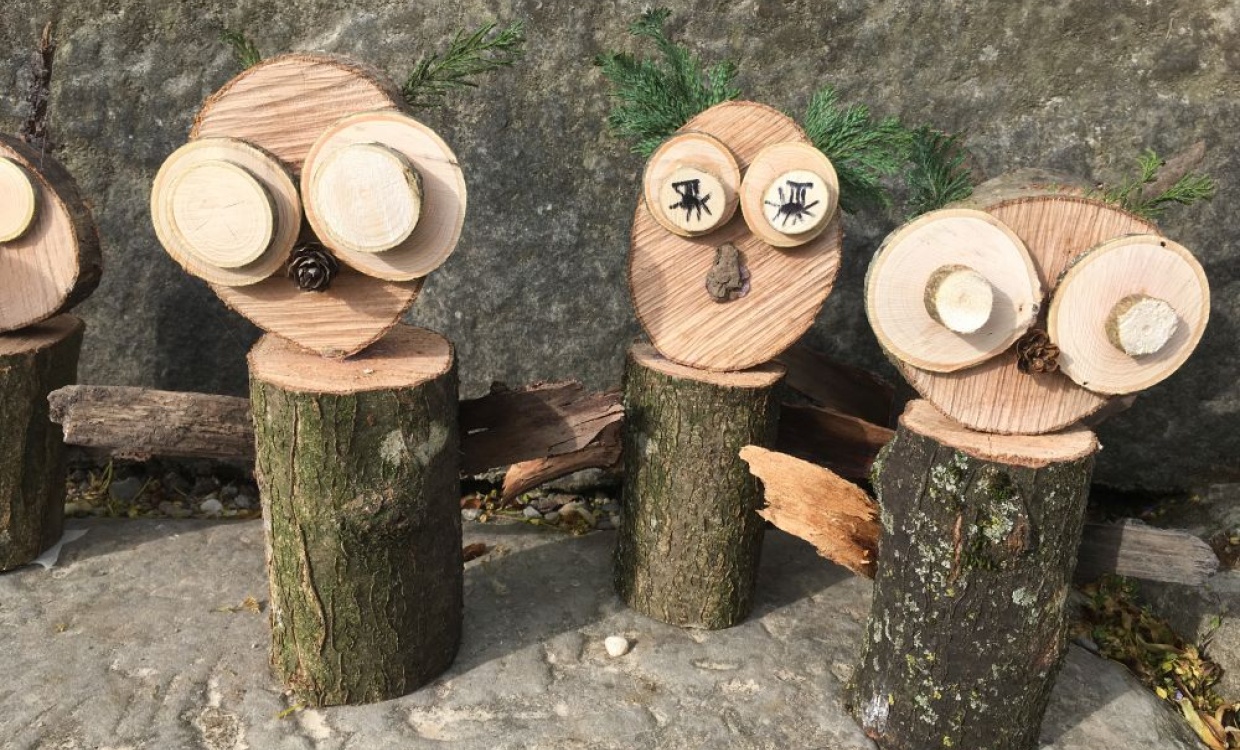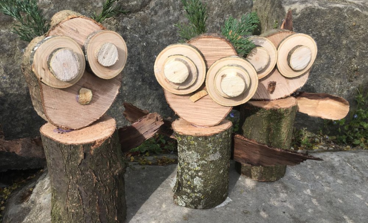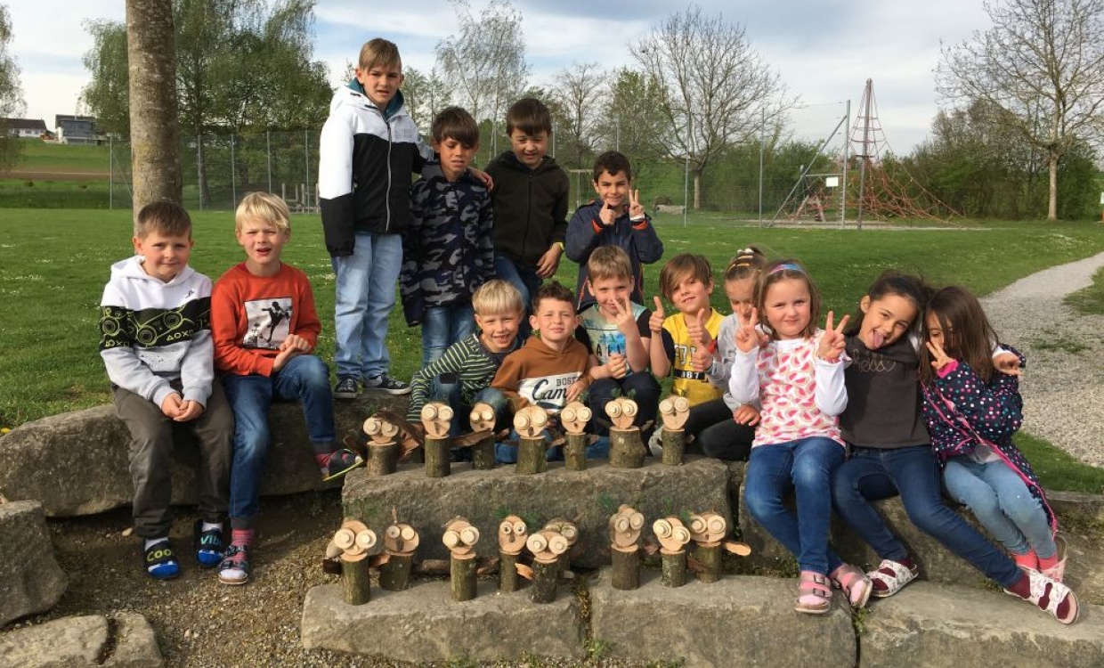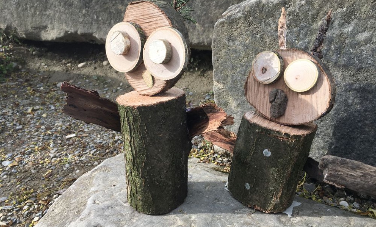 Zum Buchstaben Eu haben wir im Werken Eulen gestaltet. Andy Mittag hat uns grosse Holzköpfe geschnitten, für die kleineren Holzteile haben wir selbst zur Säge gegriffen. Im Wald haben wir verschiedene Rindenstücke und Pflanzenteile gesucht. Mit den gefundenen Stücken haben wir unsere Eule gestaltet.