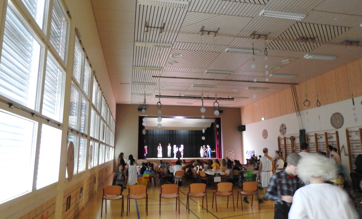 Die Tische stehen, die Bänke auch. Die Uhr tickt und nun war es so weit. Die Kinder konnten die Zeitreise antreten. Als die Kinder hinein kamen, wurden sie an ihre Plätze gewiesen. Dann fingen die Moderatoren an zu erklären, doch plötzlich ging die Zeitmaschine kaputt. Die Kinder mussten Spiele gewinnen und Zutaten sammeln. Währenddessen konnten die Kinder die nicht mitmachten, Essen und Getränke holen. Jenes bezahlten sie mit ihren Zeitreisebons. Zur Halbzeit gab es eine 20-minütige Tanzpause. Danach konnten die 5.Klässler/innen ihre Spiele spielen und die Sieger des Kostümwettbewerbs und des Quiz wurden veröffentlicht. Dann am Schluss konnten sie die gewonnenen Zutaten zusammenleeren und die Zeitreisemaschine war repariert. Das war unser Fasnachtsball.