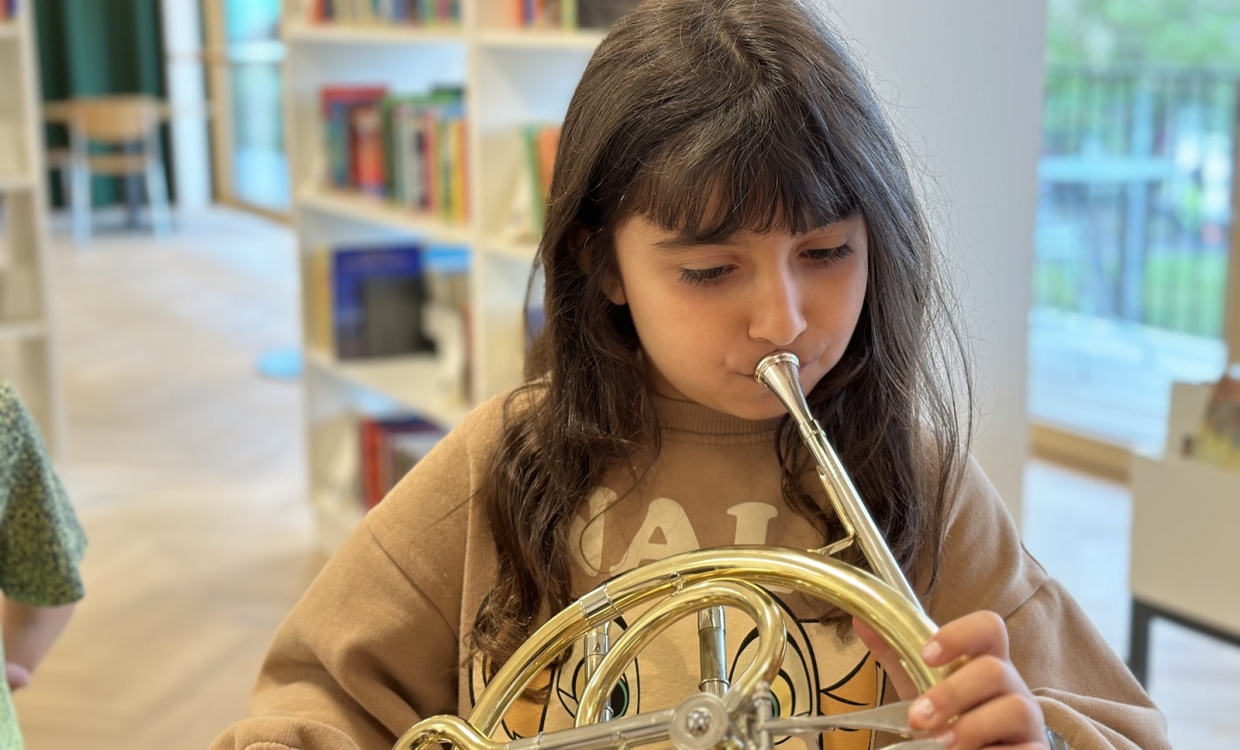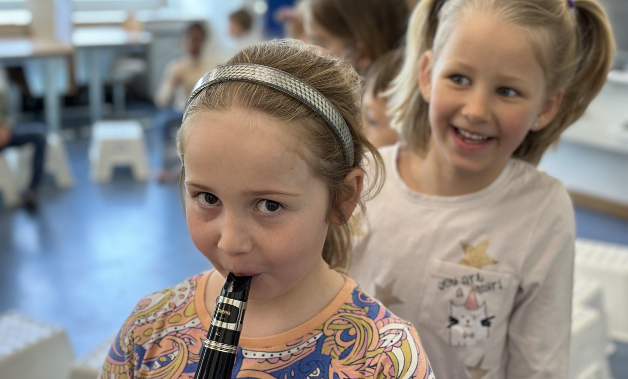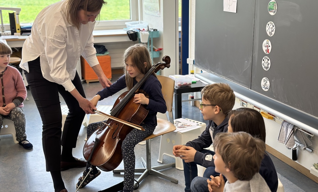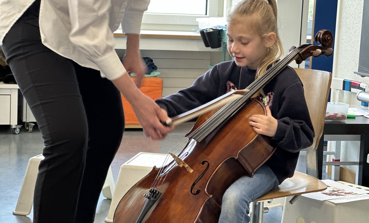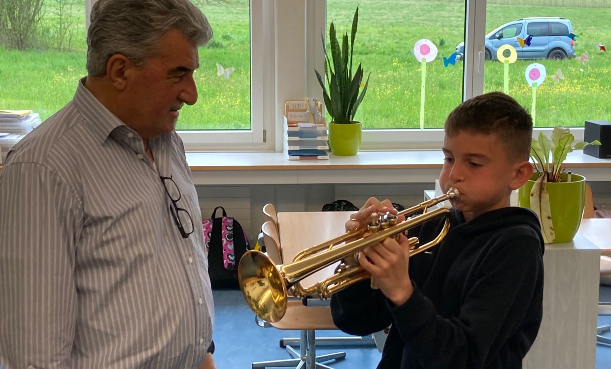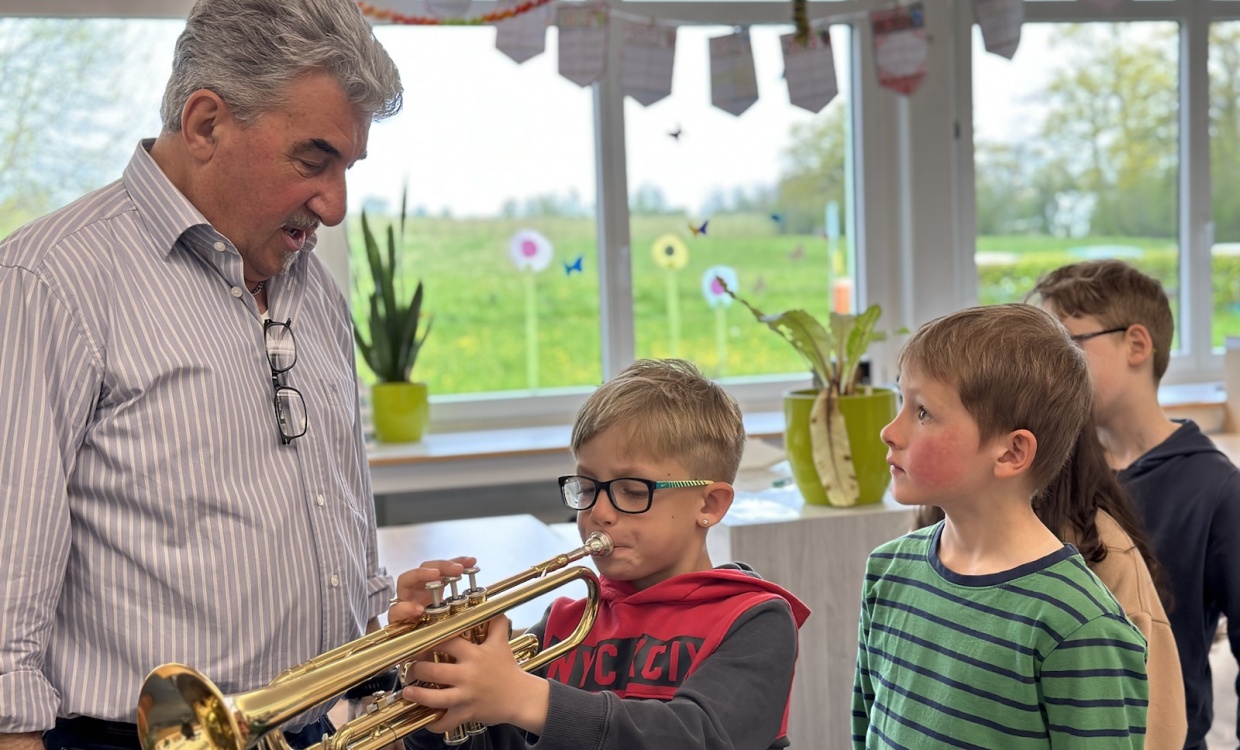 Die Musiker/innen rund um Thomas Gmünder haben die 1.-4.Klässler/innen zu Beginn mit einem interaktiven und humorvollen Konzert in der Aula auf den Instrumentenparcour eingestimmt. Im Anschluss konnten die Kinder diverse Blasinstrumente selbst testen und sogar erste Töne entlocken. Die Zeit verflog im Nu und die Gruppen huschten von Zimmer zu Zimmer. Der Parcour hat auf jeden Fall die Lust ein Instrument zu lernen geweckt.