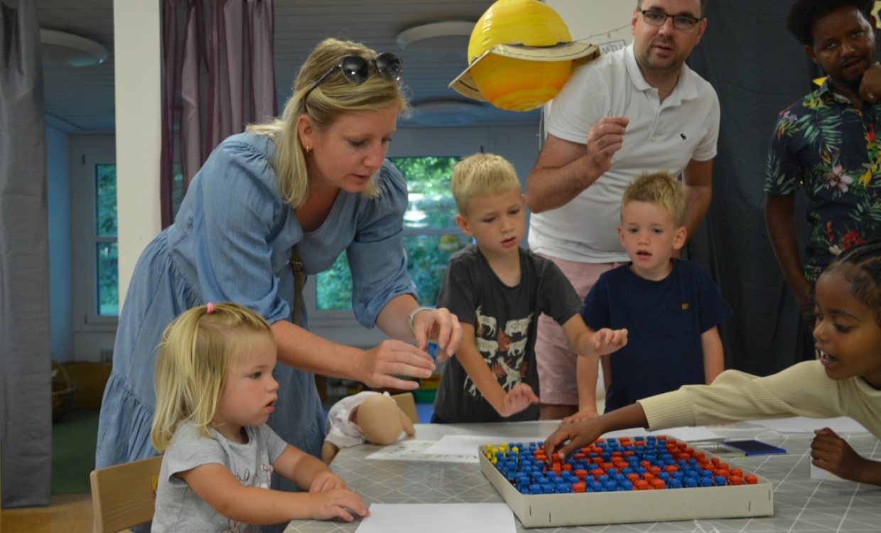Zum Thema Lernatelier konnte die Eltern mit den Kinder verschiedenen Posten ausprobieren und erforschen. Es entstanden massgeschneiderte Papierkleider, tanzende Roboter und leuchtende Glühbirnen.