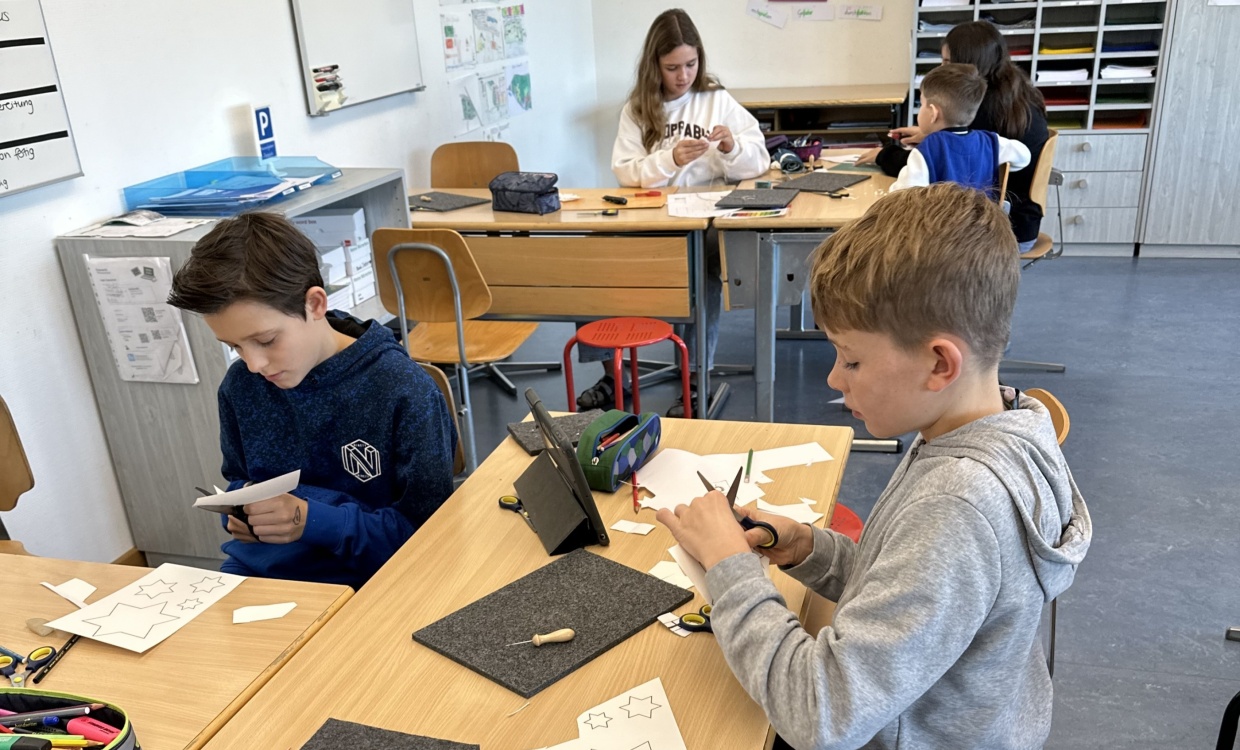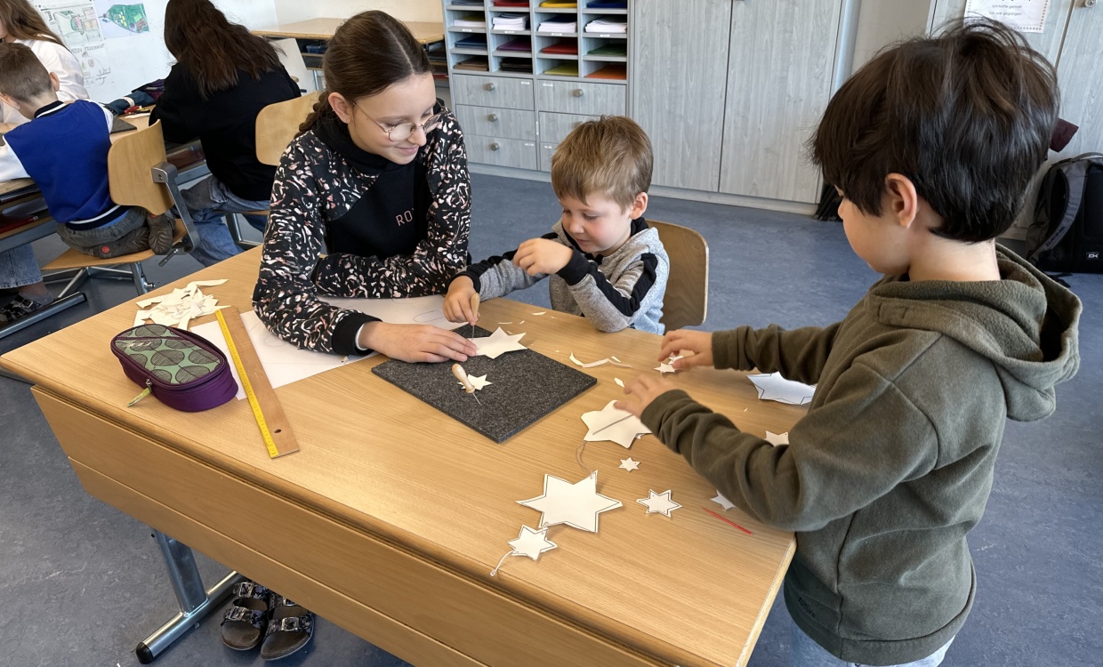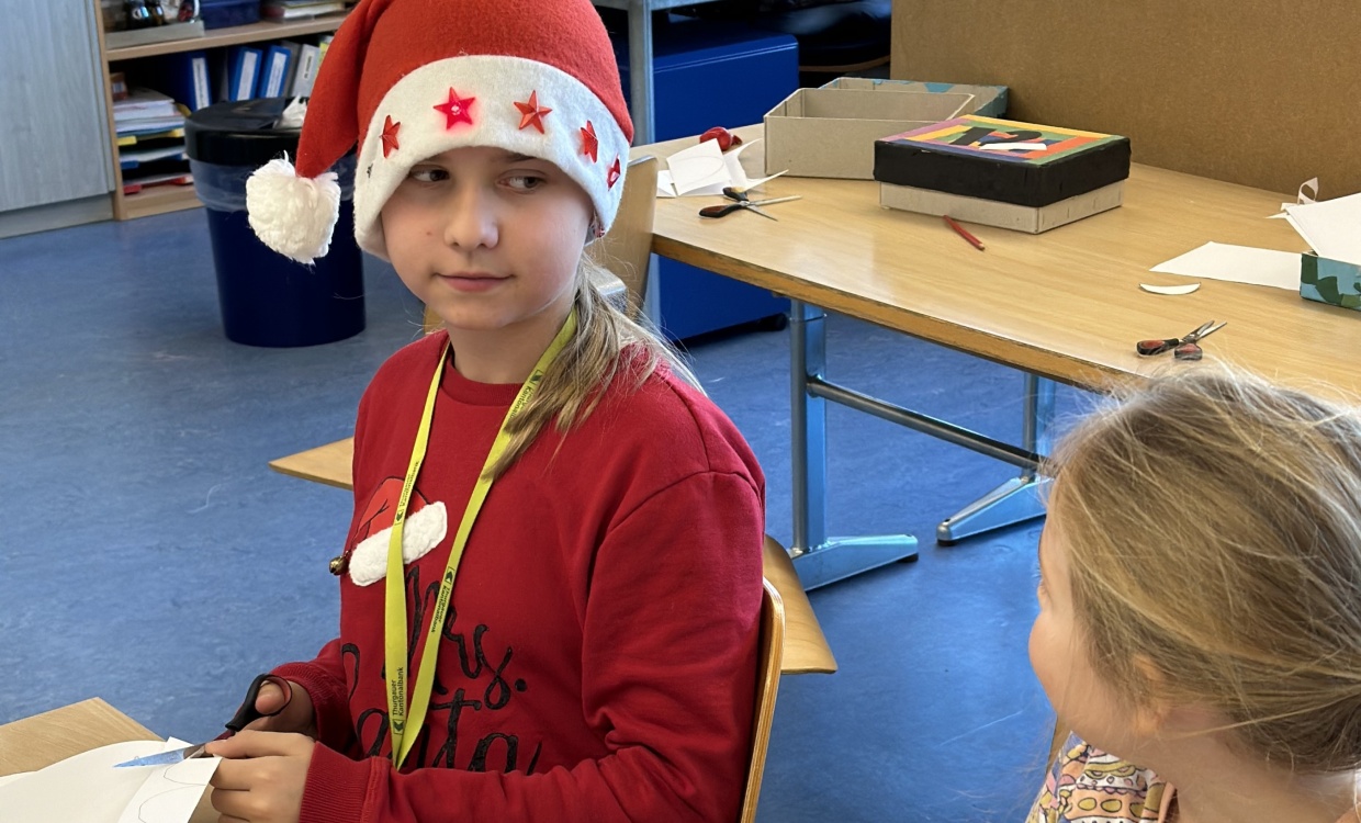 Vor der Adventszeit wurde das Schulhaus weihnachtlich geschmückt. An einem Tag wurden der Eingangsbereich, die Fenster und Gänge in klassendurchmischten Gruppen mit selbstgebastelten Dekorationen verschönert. Die Stimmung bei allen Beteiligten war entspannt und fröhlich. Mit viel Einsatz und Weihnachtsmusik verwandelte sich das Schulhaus im Laufe des Morgens in eine Winterlandschaft.