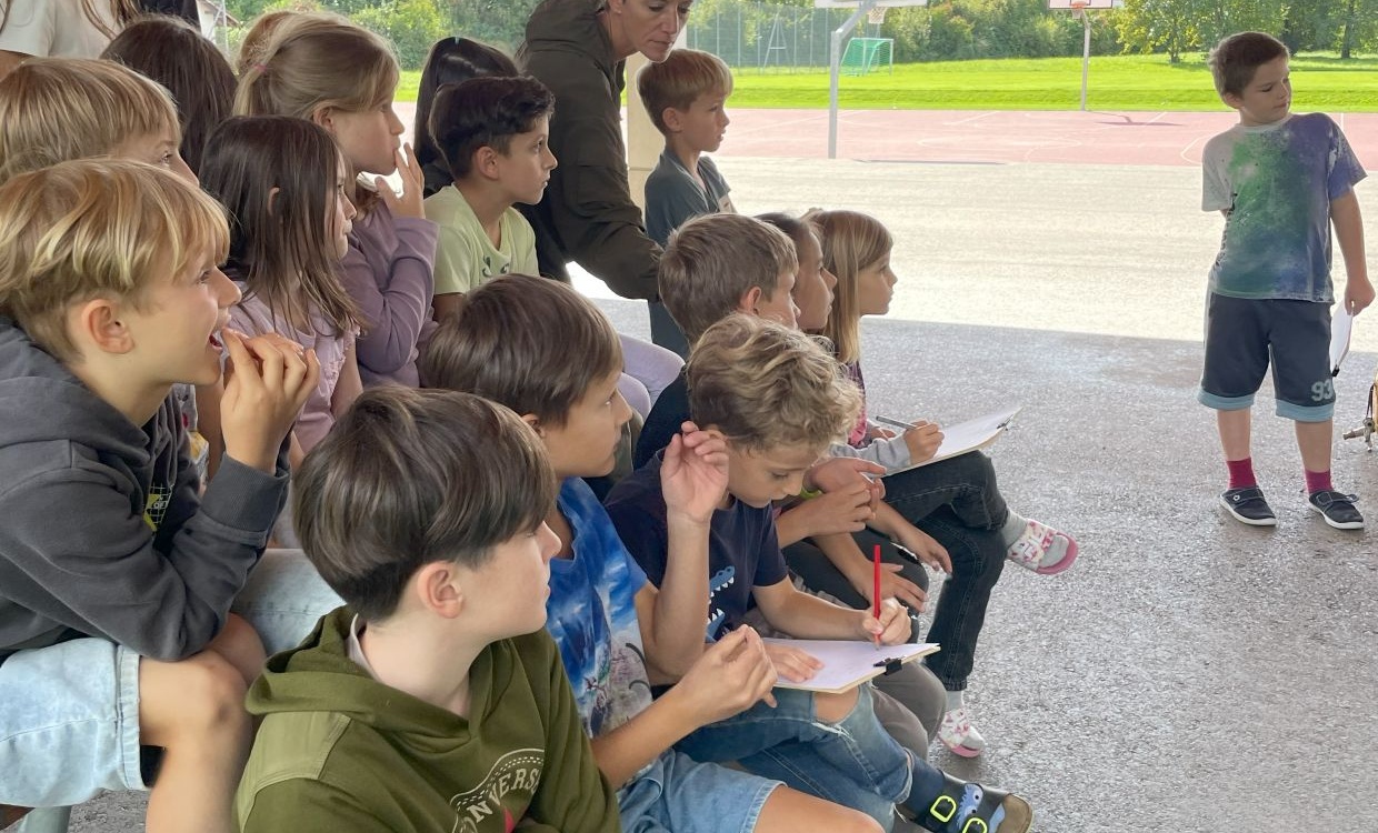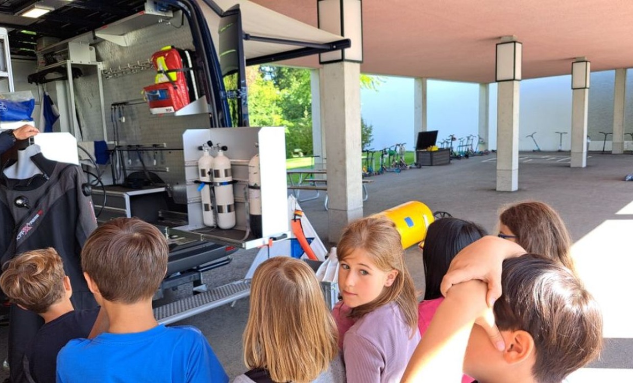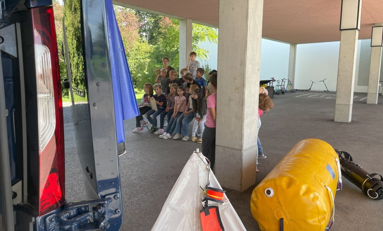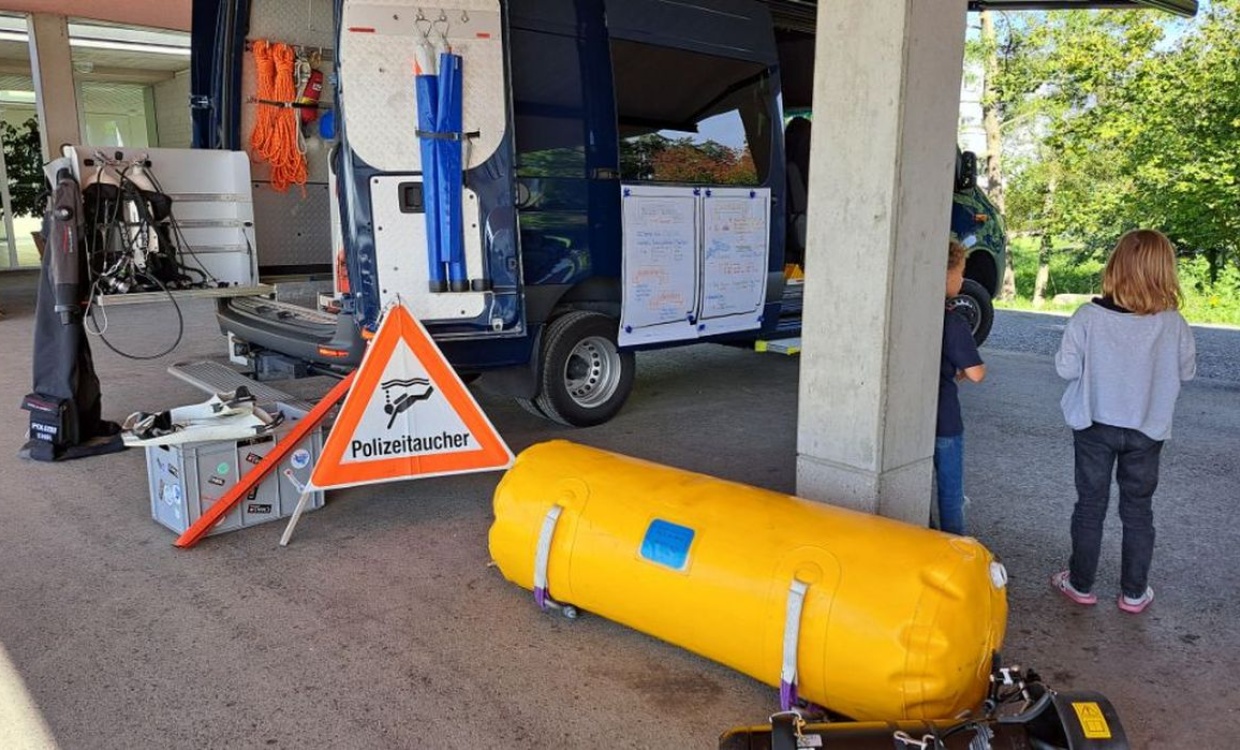 Heute kam ein Seepolizist zu uns in die Schule. Er kam mit einem grossen Tauchbus voll mit interessanten Gegenständen: Eine Tauchausrüstung, Markierungsbojen, Auftriebskörper und vielem mehr. Wir hörten spannende, schöne und manchmal auch schaurige Details von der Arbeit eines Polizisten auf dem Bodensee.