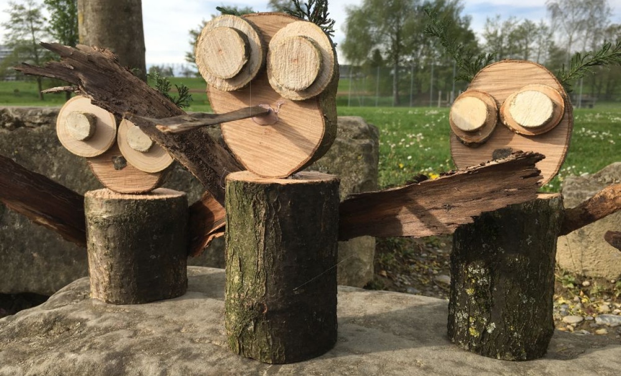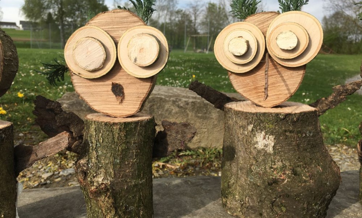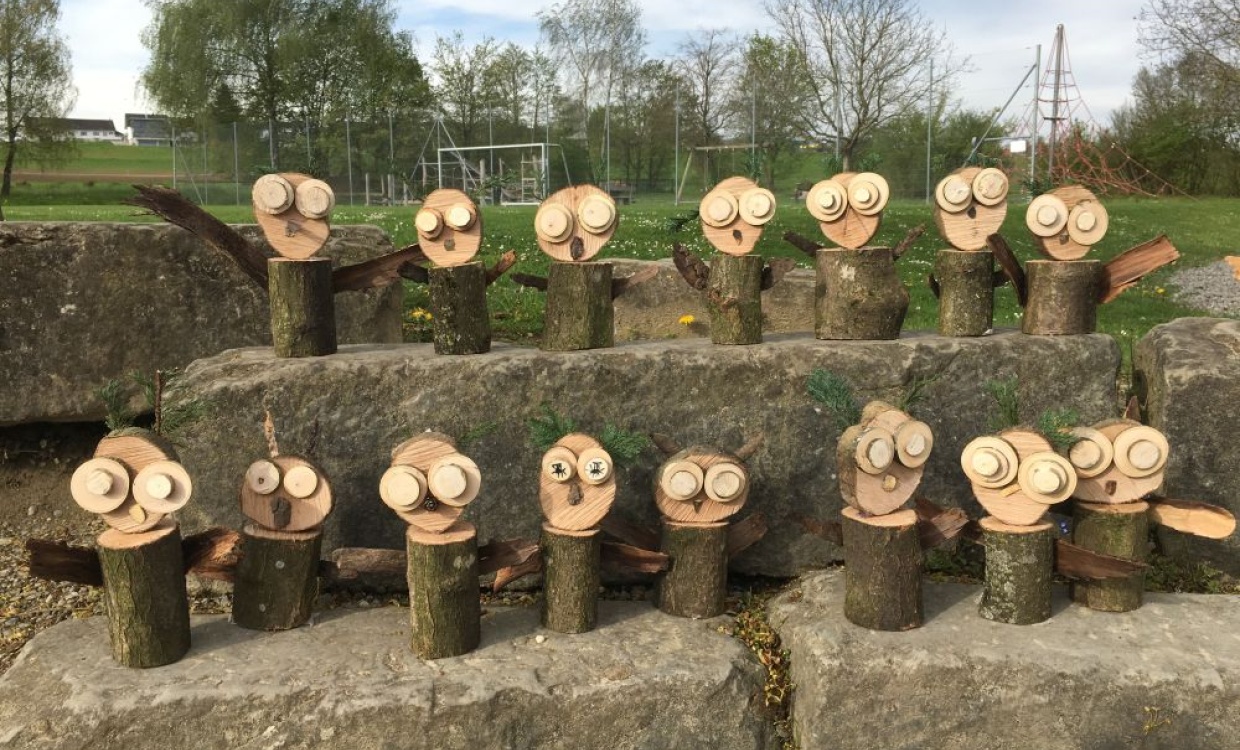 Zum Buchstaben Eu haben wir im Werken Eulen gestaltet. Andy Mittag hat uns grosse Holzköpfe geschnitten, für die kleineren Holzteile haben wir selbst zur Säge gegriffen. Im Wald haben wir verschiedene Rindenstücke und Pflanzenteile gesucht. Mit den gefundenen Stücken haben wir unsere Eule gestaltet.