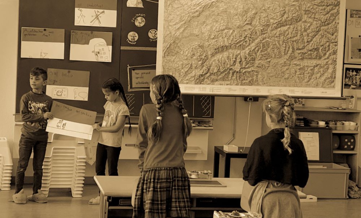 Als Abschluss des Themas „Früher-heute“ tauchte die 1. Klasse nochmals einen Vormittag lang in die Zeit von damals ein. So kamen viele Kinder dem Thema entsprechend angezogen oder sie brachten einen passenden Gegenstand mit in die Schule. Die Kinder lernten vieles über den Alltag von früher. Es war für die Klasse ungewohnt in Reihen zu sitzen und es wurde fleissig auf Schiefertafeln geschrieben.