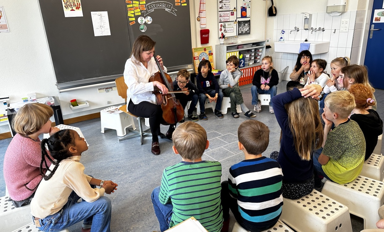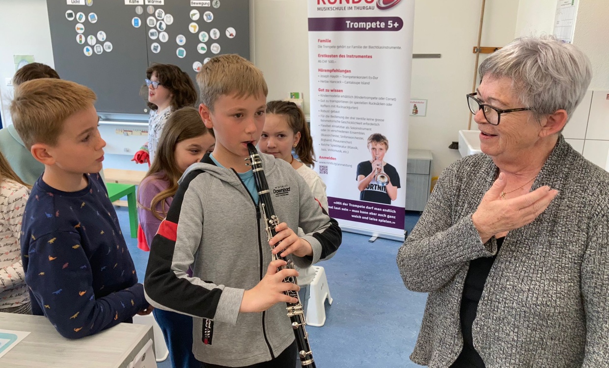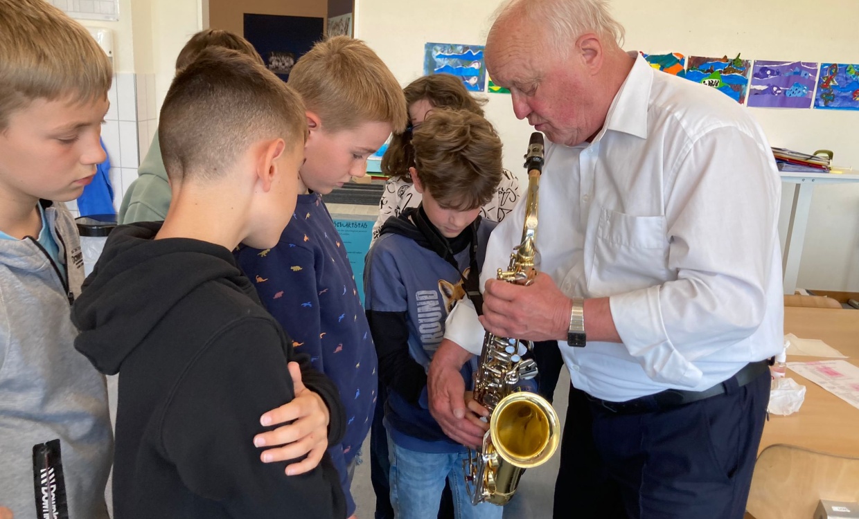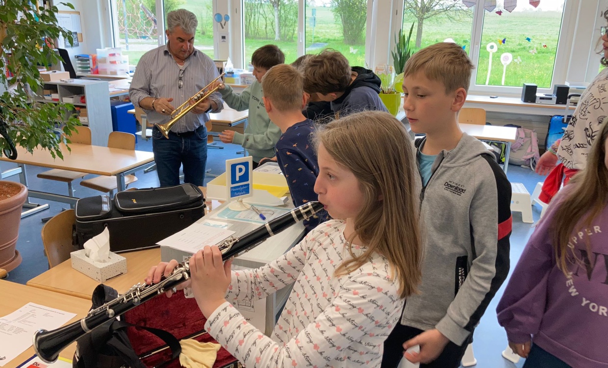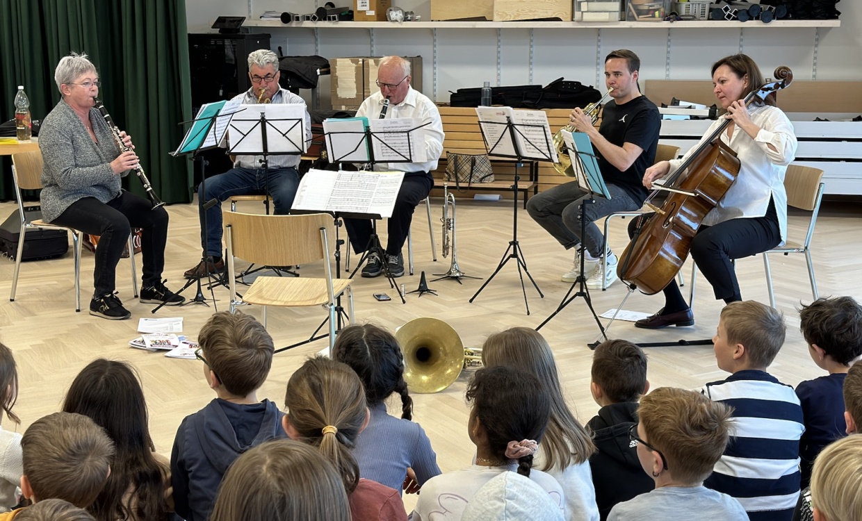 Die Musiker/innen rund um Thomas Gmünder haben die 1.-4.Klässler/innen zu Beginn mit einem interaktiven und humorvollen Konzert in der Aula auf den Instrumentenparcour eingestimmt. Im Anschluss konnten die Kinder diverse Blasinstrumente selbst testen und sogar erste Töne entlocken. Die Zeit verflog im Nu und die Gruppen huschten von Zimmer zu Zimmer. Der Parcour hat auf jeden Fall die Lust ein Instrument zu lernen geweckt.