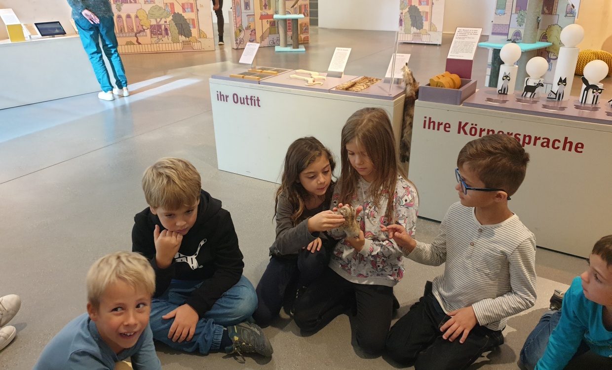 Die erste Klasse macht einen Ausflug ins Naturmuseum. Dort führt uns Frau R. durch die Katzenausstellung. Spielerisch lernen die Kinder diese Tiere besser kennen. Sie erfahren sehr viel Interessantes, Spannendes, Neues...Es bleibt auch Zeit, die Ausstellung eigenständig zu erkunden...Wir kehren mit einer glücklichen Kinderschar zurück.